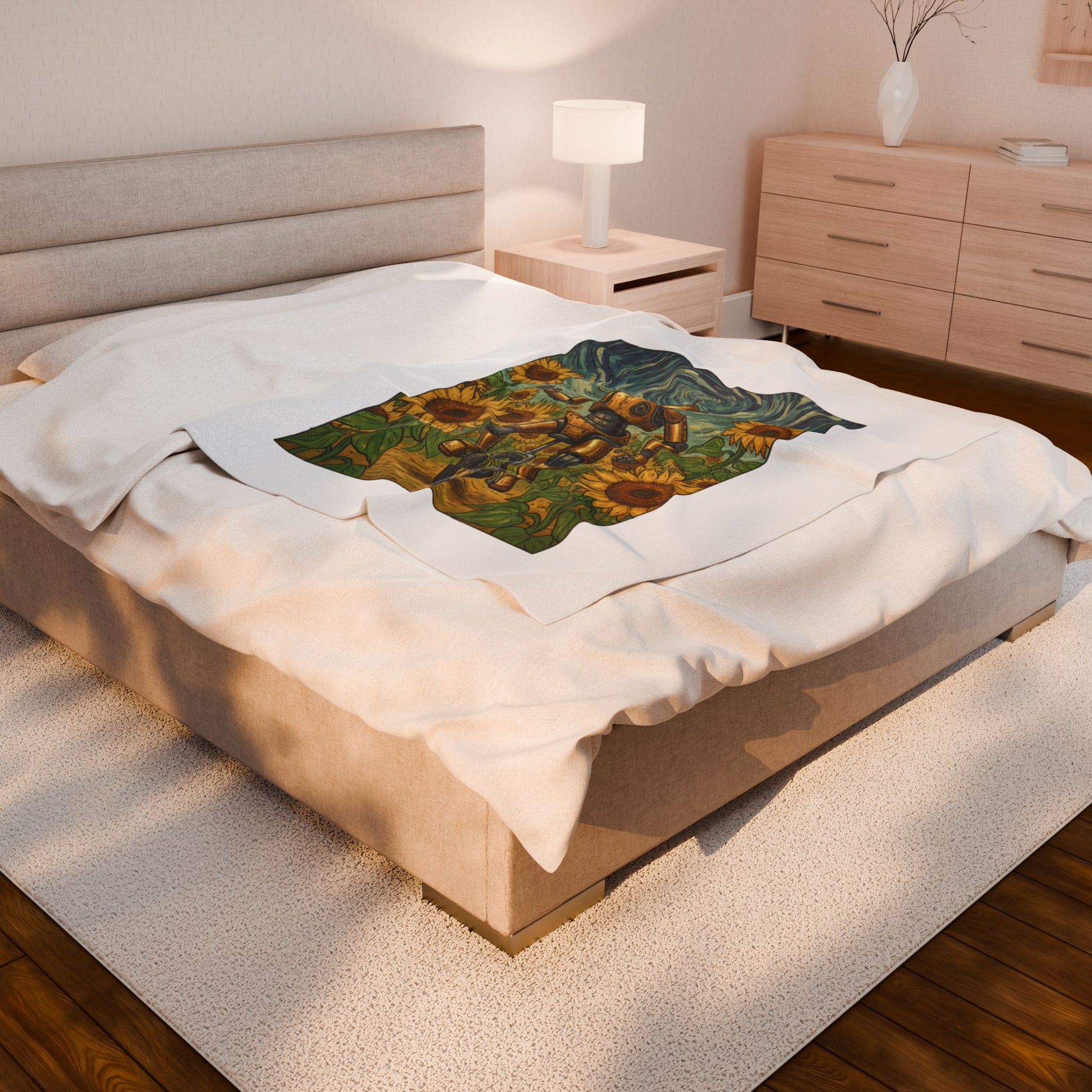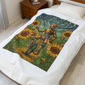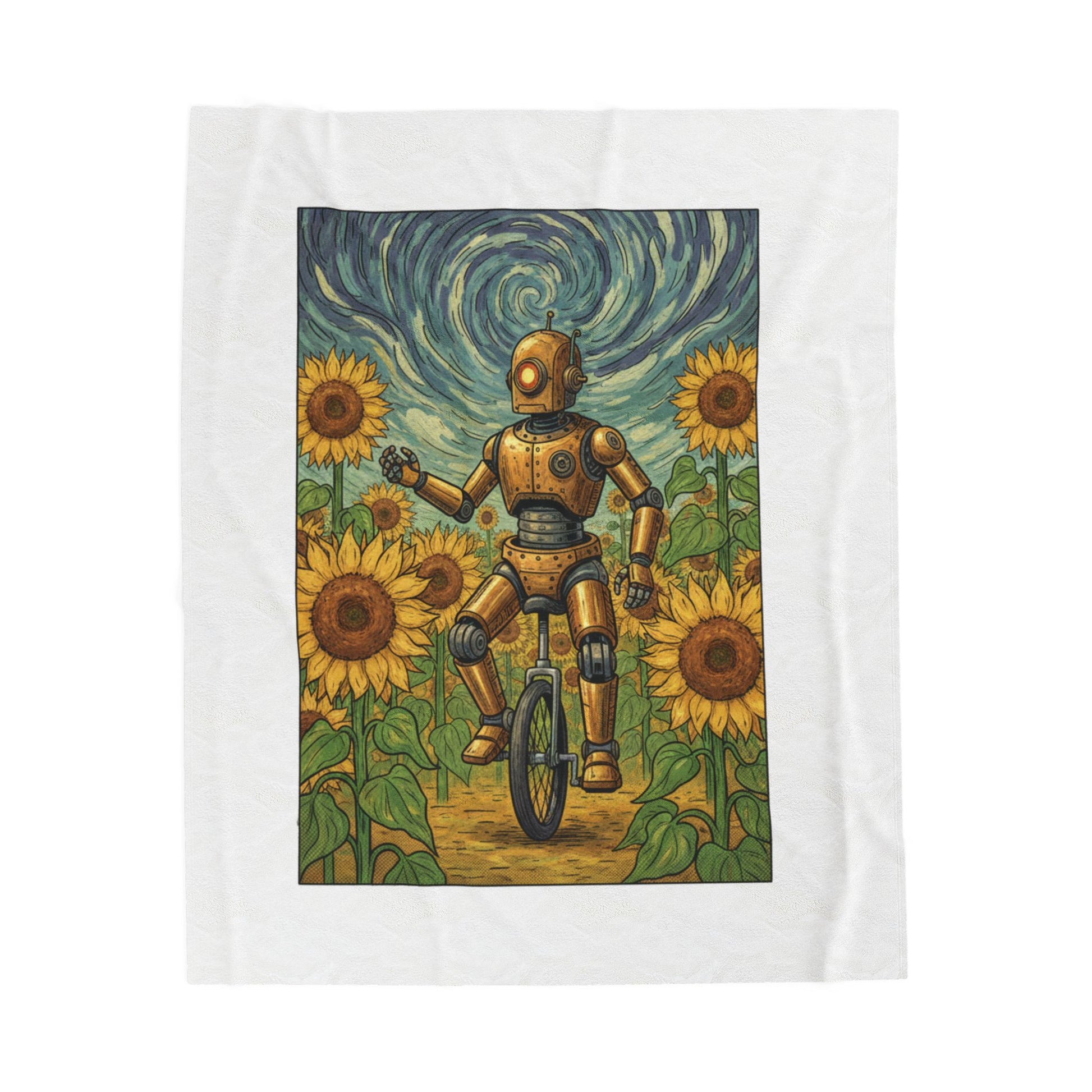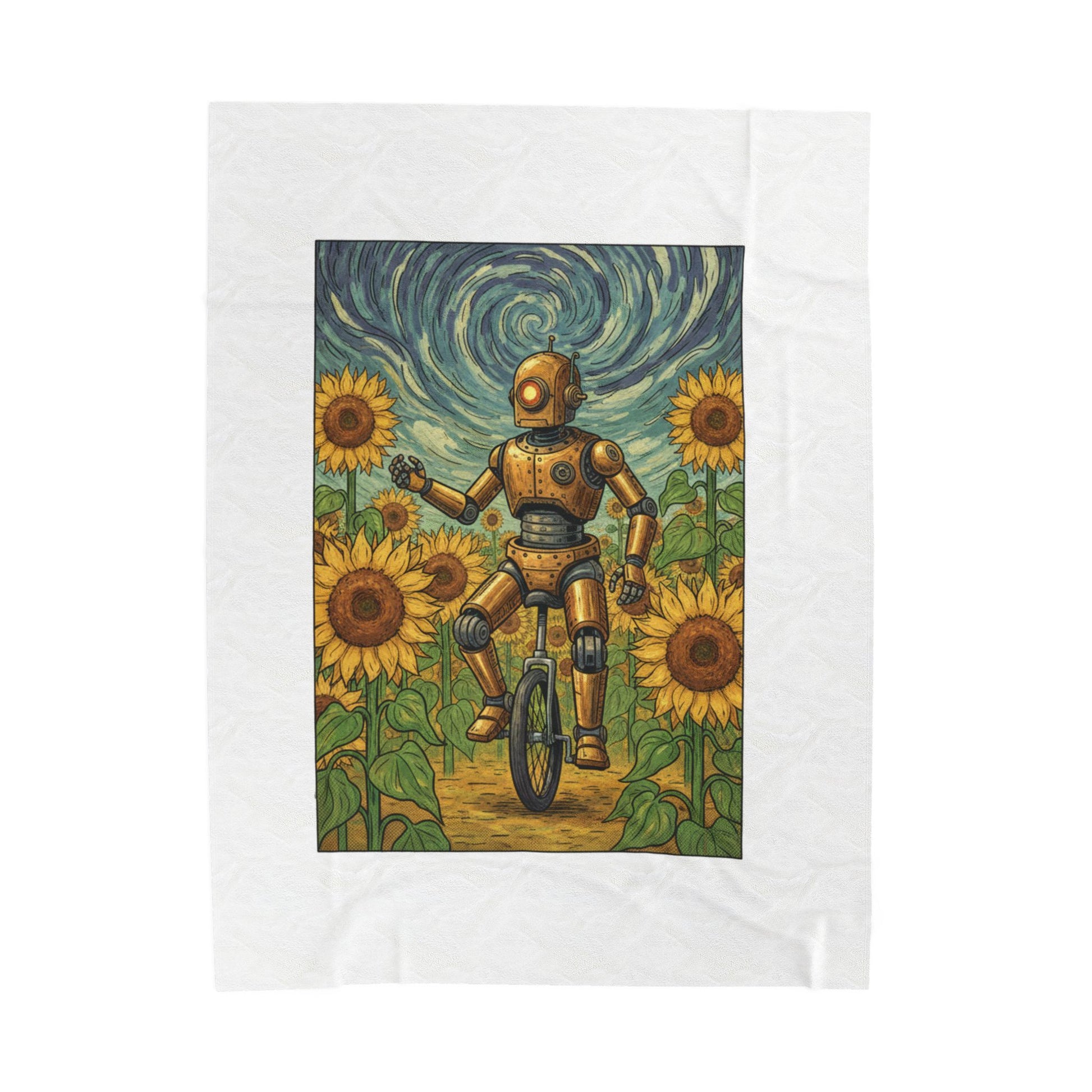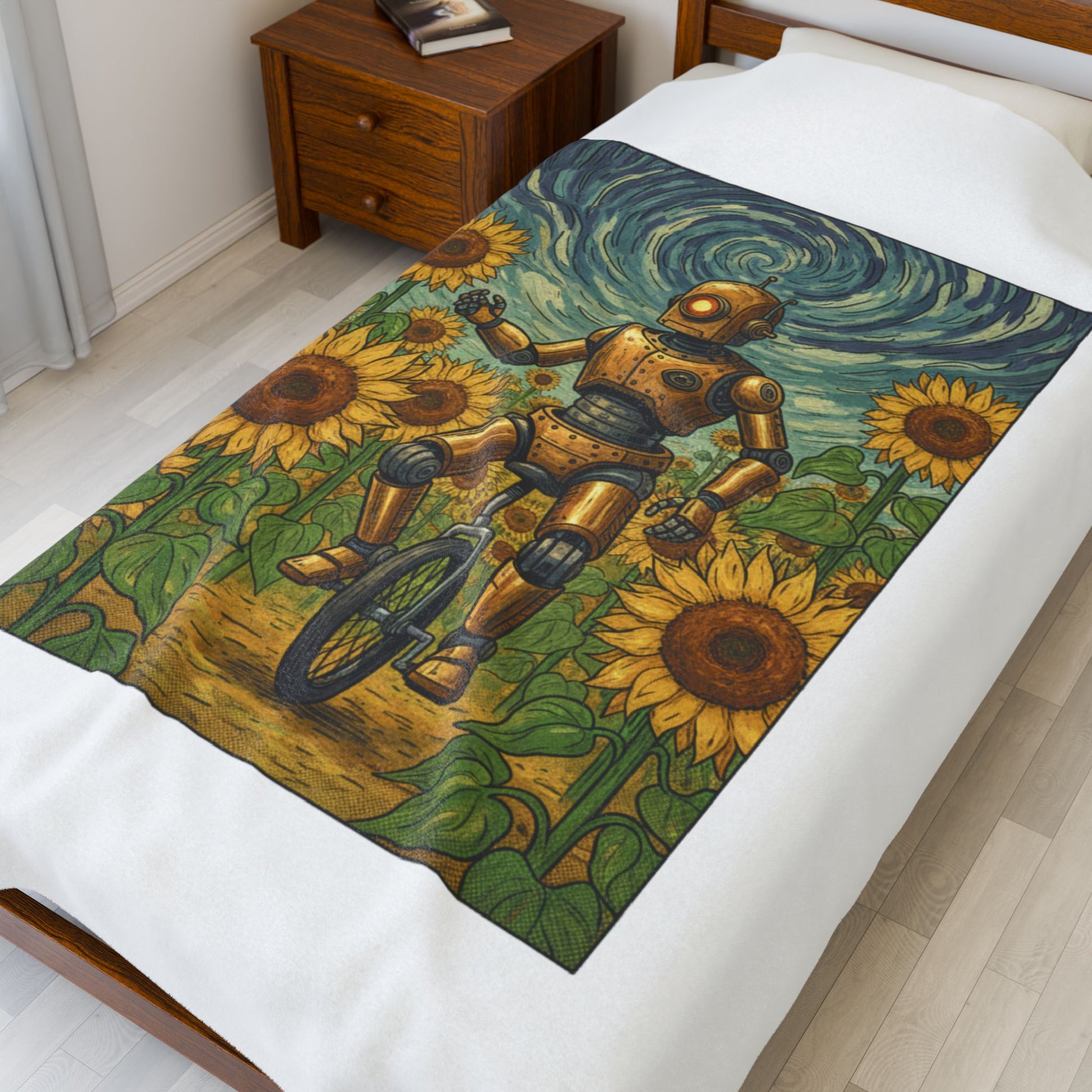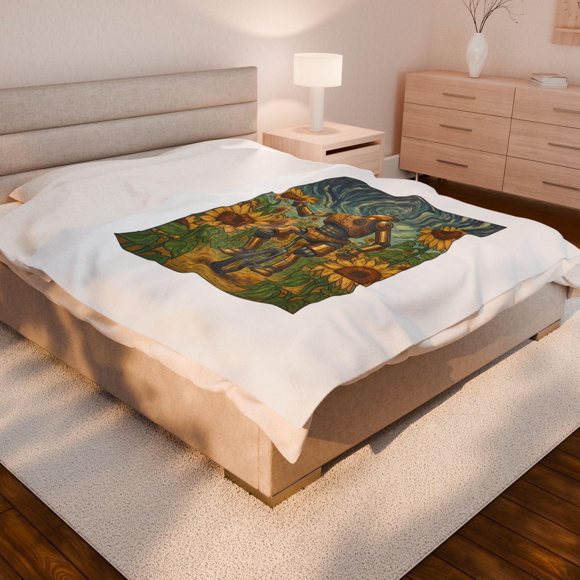 Robot in Sunflowers Velveteen Blanket — Cozy Vintage Sci‑Fi Throw